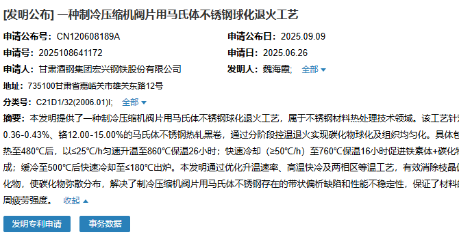 酒鋼宏興申請(qǐng)“一種制冷壓縮機(jī)閥片用馬氏體不銹鋼球化退火工藝”專(zhuān)利