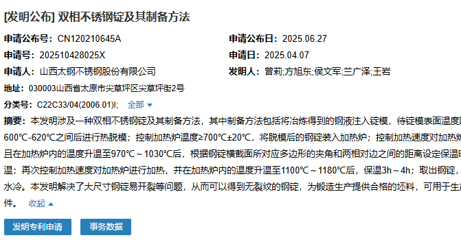 山西太鋼成功申請(qǐng)一項(xiàng)名為“雙相不銹鋼管坯及其制備方法”專利